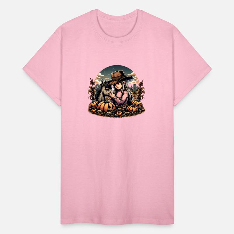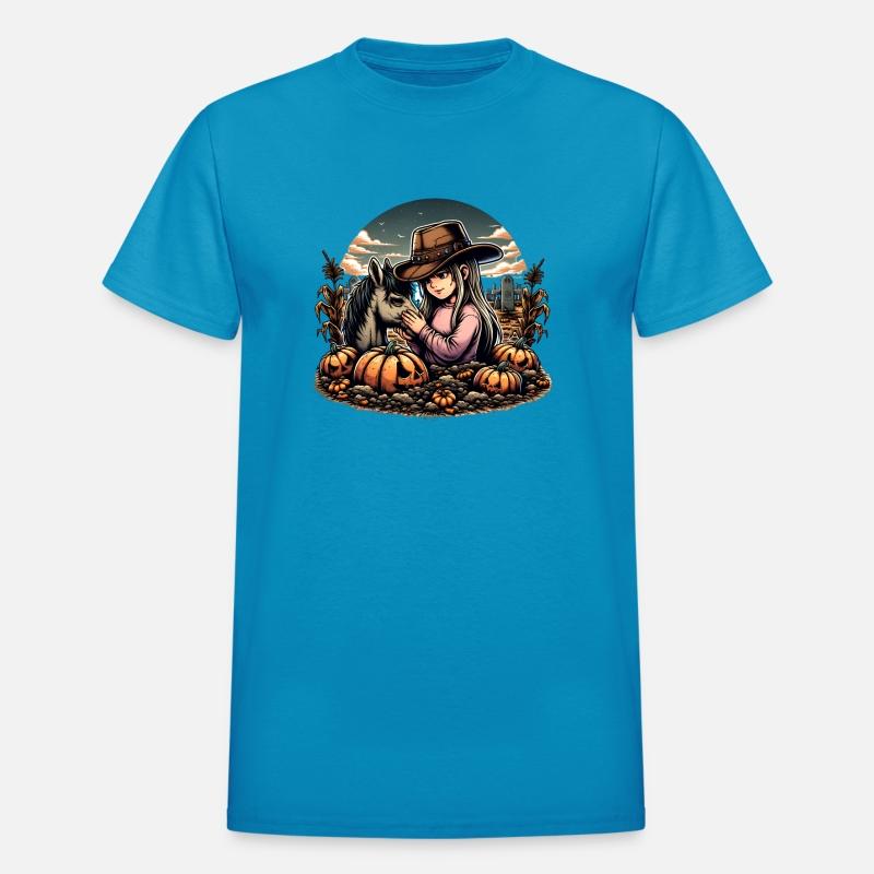 Autumn Cowboy Girl with Horse in Pumpkin Patch