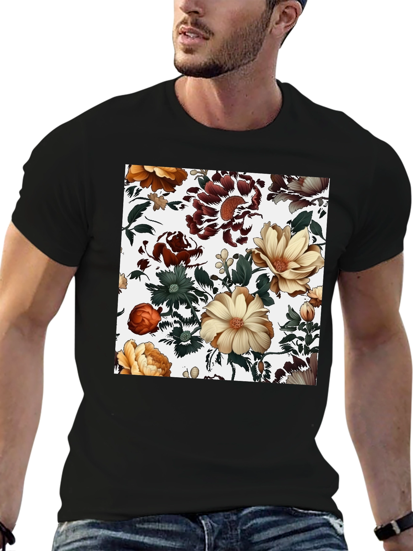 Elevate your casual style with this striking black t-shirt featuring a vibrant floral print. The design showcases an array of intricately detailed flowers in hues of brown, orange, and cream against a white backdrop, creating a visually appealing contrast. Crafted from a soft, breathable fabric, this tee offers all-day comfort and a relaxed fit. Perfect for adding a touch of artistic flair to your everyday wardrobe, this t-shirt pairs effortlessly with jeans, shorts, or chinos. Ideal for casual outings, weekend gatherings, or simply expressing your unique style. Make a statement with this eye-catching floral t-shirt.