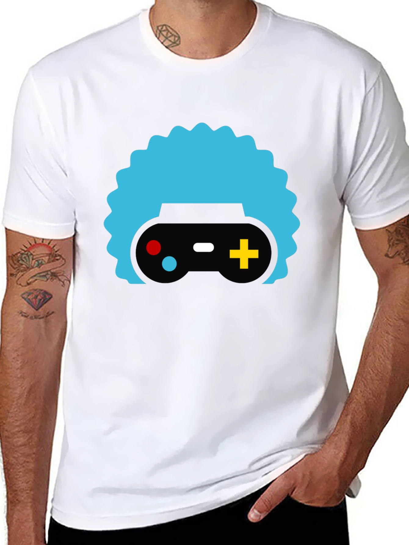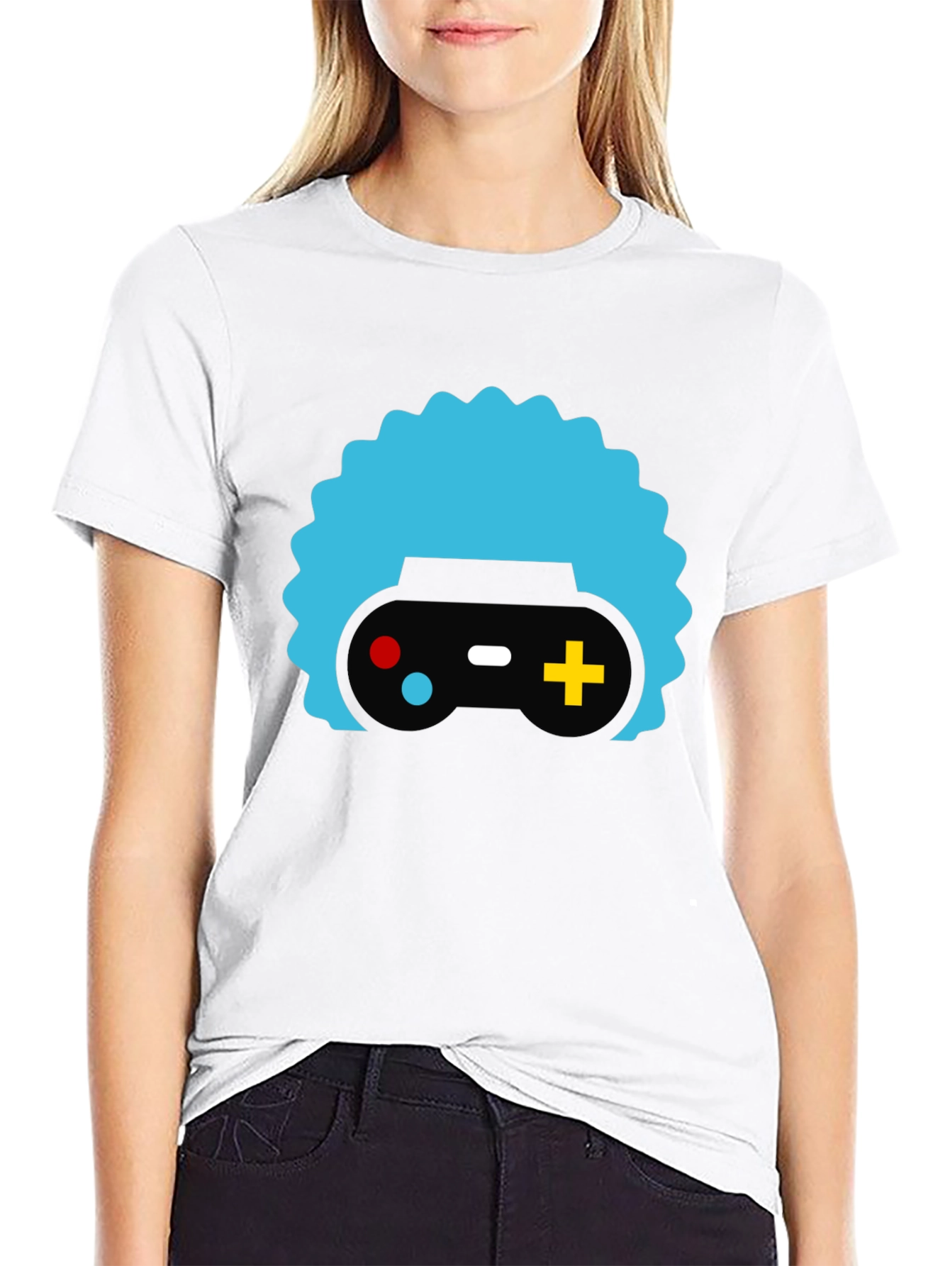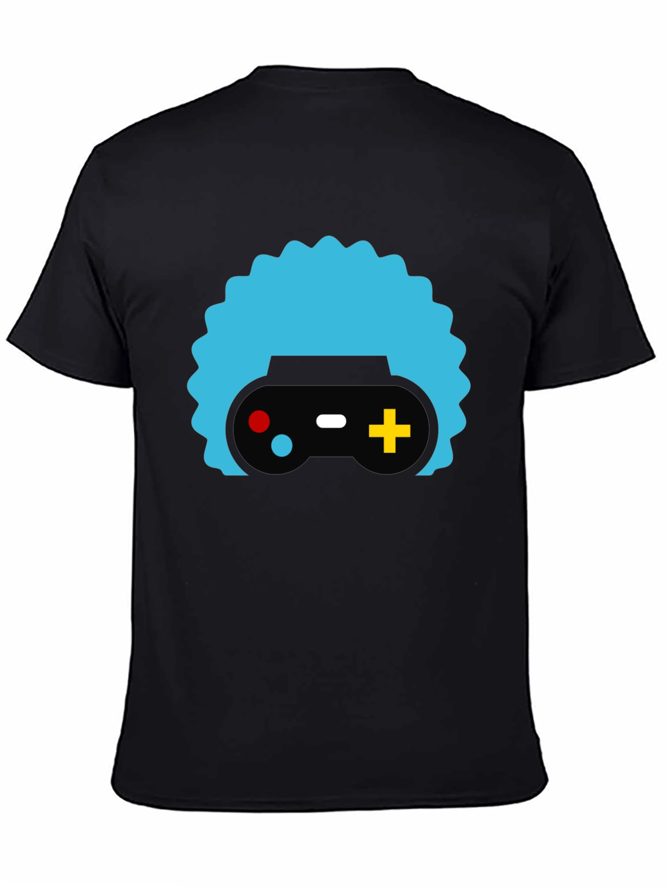 Show off your gaming passion with this stylish black t-shirt. Featuring a bold graphic print of a retro game controller stylized with a unique, vibrant light blue afro-like design, this tee is sure to turn heads. The controller graphic includes a black base with red, white, and yellow accents. Made from what appears to be a soft, breathable cotton blend, this t-shirt offers both comfort and style. Perfect for casual wear, gaming events, or just expressing your love for all things gaming. Pair it with jeans or shorts for a laid-back look. Get yours today and level up your wardrobe!